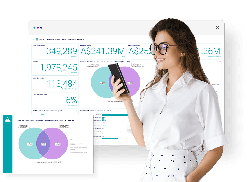 Verschaffen Sie sich einen klaren, präzisen Überblick über Ihre Kundendaten. Setzen Sie sich mit unserem Team in Verbindung, um mehr über die Apteco Orbit Dashboards zu erfahren.
