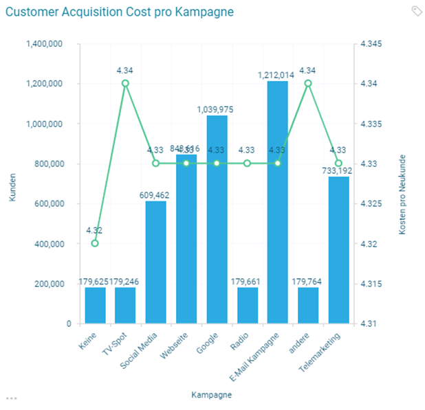 Abbildung 2 stellt die Kundenakquisitionskosten je nach Marketing Kampagne in einem multidimensionalen Balkendiagramm dar. Die Messwerte auf der linken Y-Achse zeigen die Gesamtanzahl der Kunden, die über die jeweiligen Kampagnen akquiriert worden sind und die rechte Y-Achse sowie der grüne Graph, der sich durch die Balken zieht, weisen den Kostenaufwand auf, der im Durchschnitt pro Kampagne anfiel.