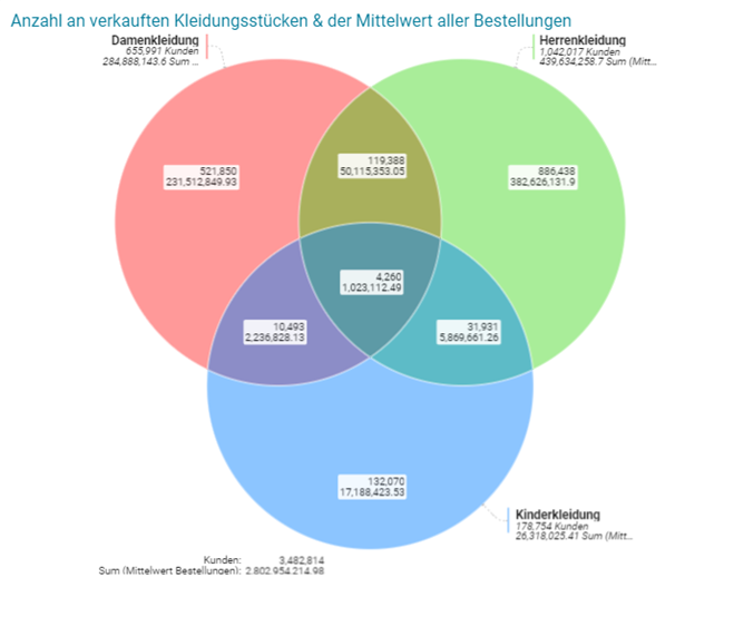 Bei der ersten Abbildung handelt es sich um ein 3-dimensionales Venn Diagramm, das eine Übersicht zu der Gesamtanzahl gekaufter Kleidungsstücke, deren Schnittmengen sowie den Mittelwert aller Bestellungen in den jeweiligen Mengen bietet. Hier können beliebige KPIs miteinander kombiniert werden, um zu schauen, inwiefern diese in Zusammenhang miteinander stehen.